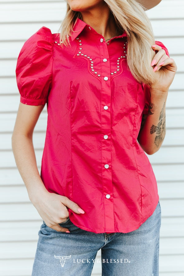 This bold short sleeve snap shirt delivers standout cowgirl style with a polished, feminine edge. Featuring classic western yoke detailing accented with silver stud embellishments, this vibrant pink blouse brings modern flair. Puff sleeves add a flattering shape, while the structured snap-front closure keeps it authentic and versatile.